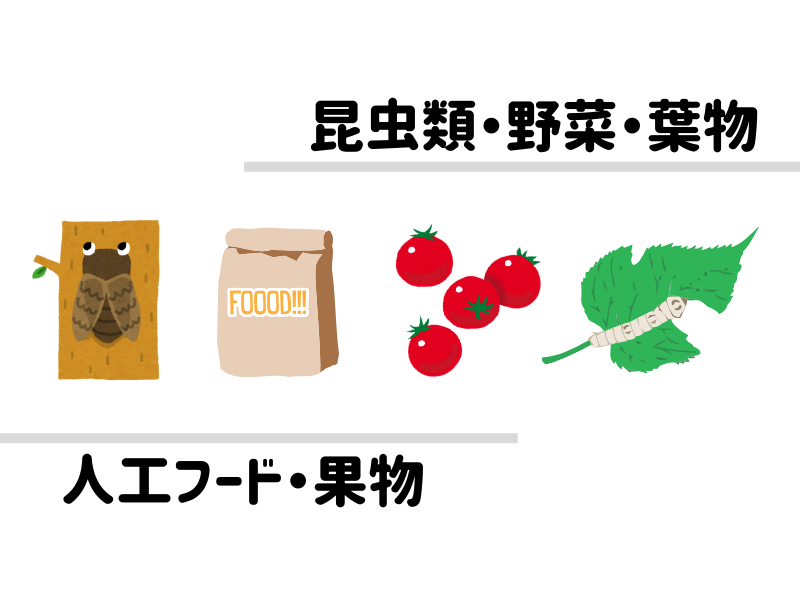 | 成体(アダルト期) | 週に2回〜毎日1回 | 腹八分目(エサへの反応が鈍くなるまでなど) | 状況によっては人工フードとをメインに、昆虫や野菜をおやつとしてもよい。 |